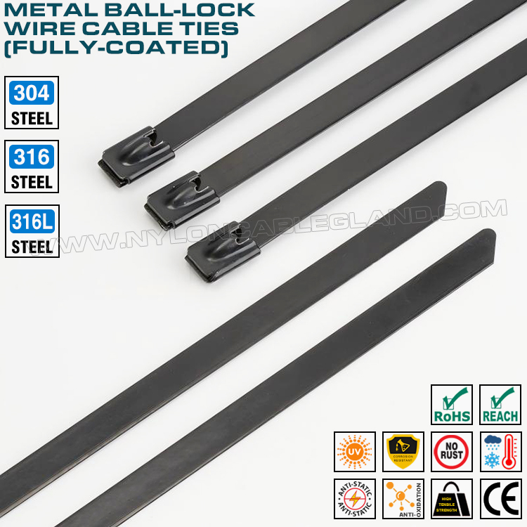 完全コーティングステンレス鋼製ケーブルタイ(金属製結束バンド)は,ボールロック機構を備え,表面全体がエポキシ樹脂(ポリエステルまたはナイロン11)で完全にコーティングされたファスナーです.金属製バックルとベルトはステンレス鋼304,316または316L製で,表面全体がエポキシ樹脂(ポリエステルまたはナイロン11)層で完全に覆われています.コーティングはケーブルタイに追加保護を提供し,耐食性・耐摩耗性を高め,美観を向上させます.電力システム,化学工業,船舶,石油,機械,配管,導管,園芸,農業などの分野における固定・結束に広く使用されています.